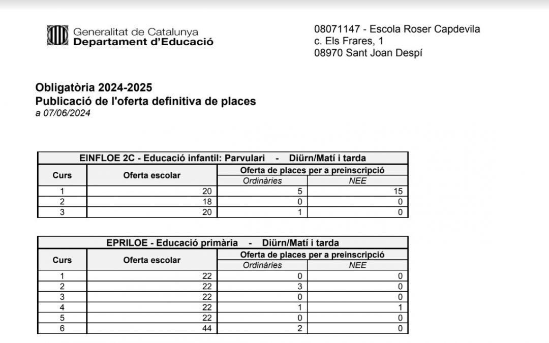 Publiquem l’oferta definitiva de places pel curs 2024-2025
