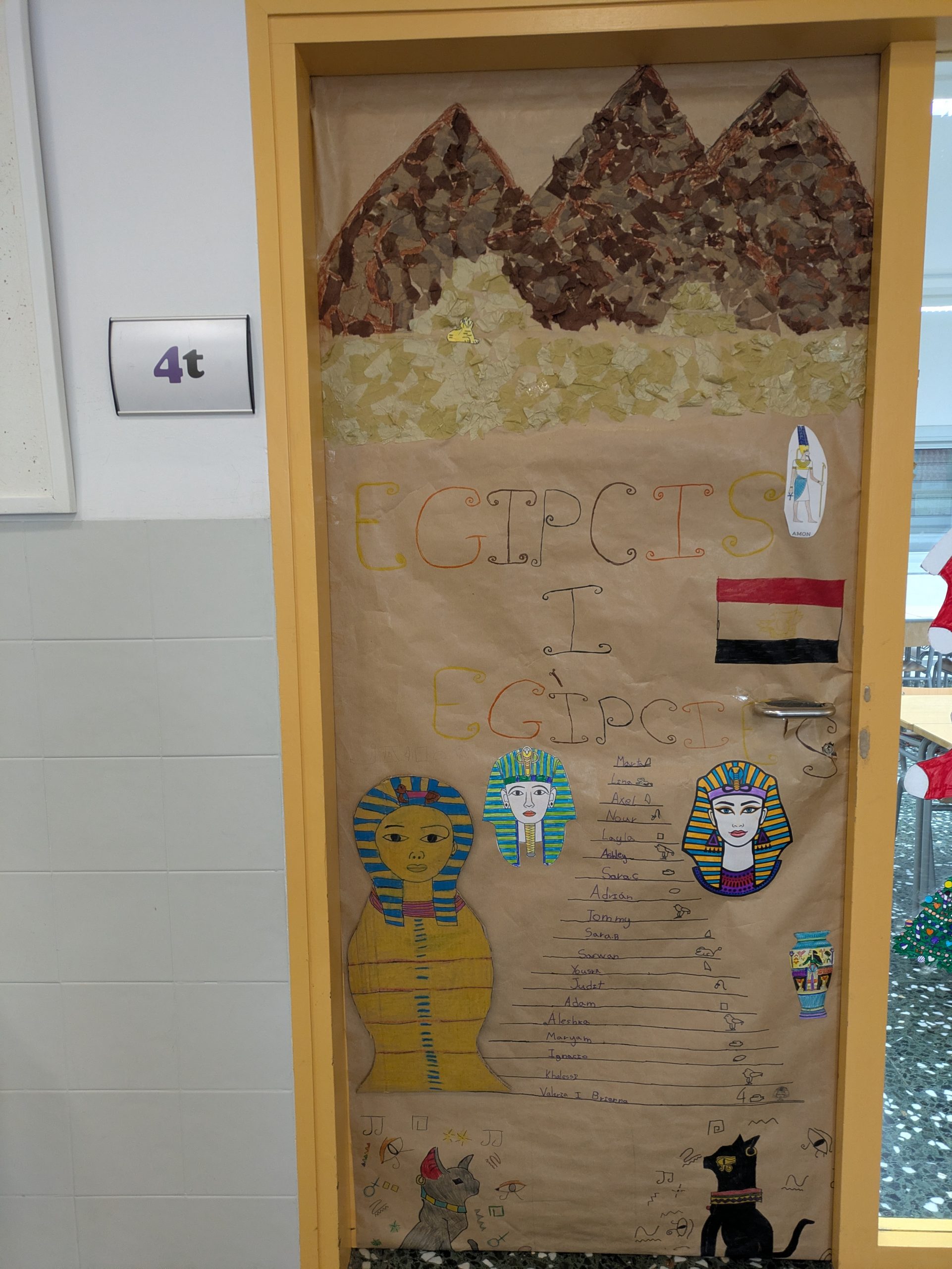 Hem investigat tant, que hem descobert també perquè es feien les piràmides, quina material utilitzaven i fins i tot que era la momificació. Però no ens podem oblidar que també hem conegut el seu alfabet i hem pogut escriure el nostre nom. Això ha sigut una passada. També hem pensat com volíem fer la porta de la nostra classe, hem fet el disseny entre tots per decidir que posar i finalment hem decorat la porta entre tots, cadascú ha fet alguna part de la decoració.